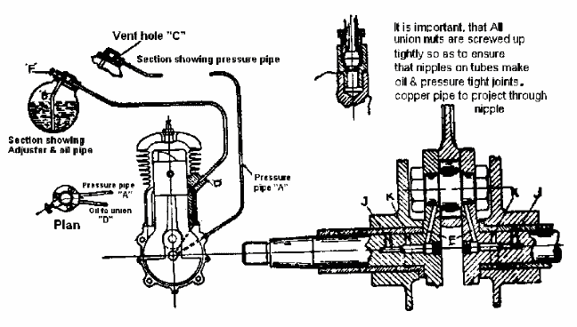 soda water is forced up the centre tube of a soda syphon. The oil passes the regulating screw "F," and issues into the cup of the sight feed except in the Mark III Lubricator where it passes straight to the engine. From this the oil descends to the engine through a union "D" on the front of the cylinder except in certain Models where it passes straight to the crankcaae. Here the oil divides, part of it being sucked through a hole in the cylinder wall uncovered by the piston, and the rest passing down to the crankcase, where it is again divided between the two main bearings.